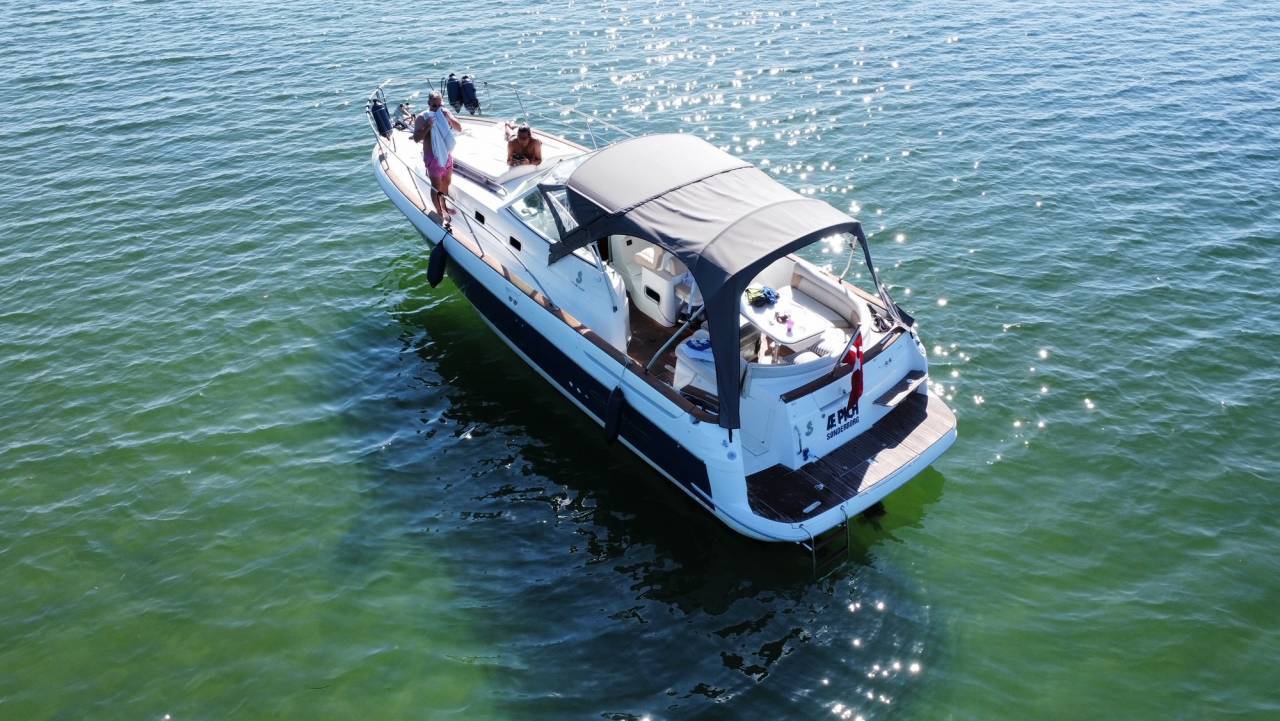 Hele agter cockpittet kan enten lukkes af med sider, så I også kan bruge båden på de køligere regnvejrsdage, eller blot bruges som en bimini, der gier en behagelig skygge på de varme solskindsdage, som vi heldigvis også har rigtig mange af i skønne Danmark.