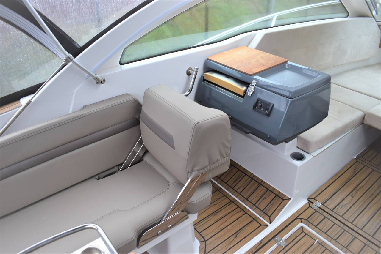 Fra pilotstolen har du et rigtig fint overblik over alle instrumenter og i øvrigt hele båden - her finder du bl.a. en Garmin kortplotter, joystick til bovpropellen og til bådens trimtaps. Pilotstolen kan vendes, således man kan være med i snakken omkring bordet. Foran pilot pladsen, kan du løfte en hynde i sofaen og åbne en låge i gulvet, hvorefter du har mulighed for at bruge bådens sø-toilet.