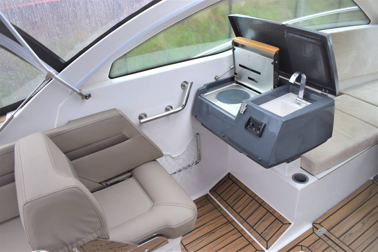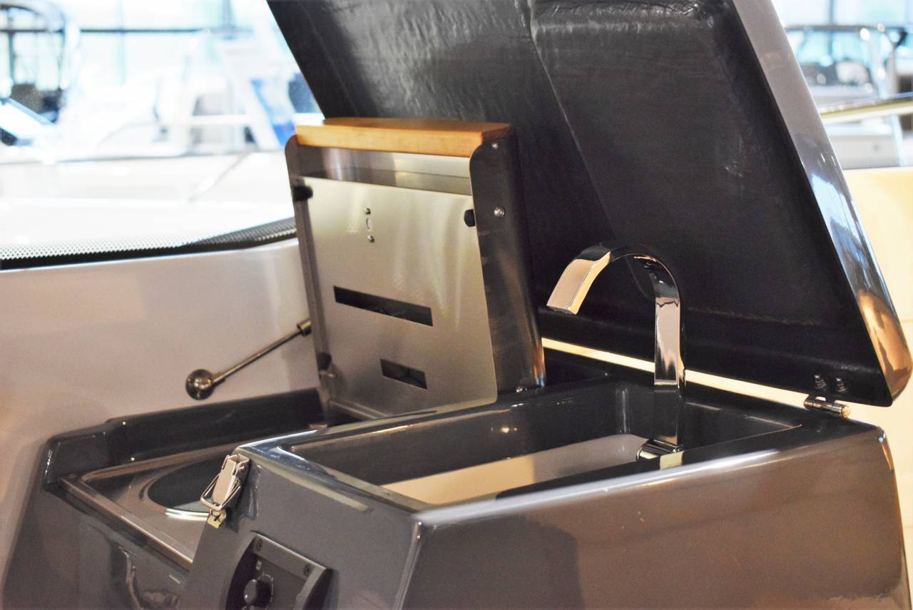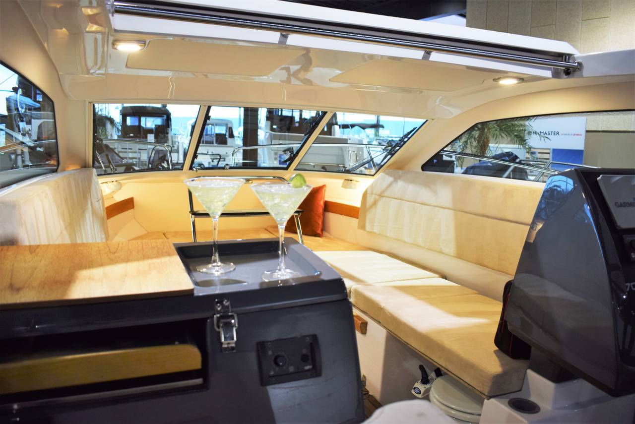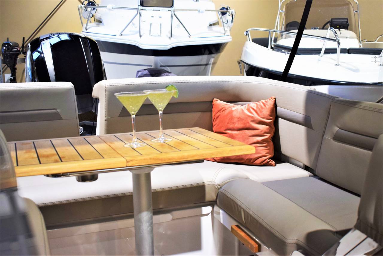 Med adgang fra bådens forlængede agter badeplatforme, træder du ind igennem styrbordside til et åbent layout, hvor du bliver mødt af mere plads, end hvad man normalt kan forvente sig af en 23 fods båd, der i øvrigt bliver trykket frem i vandet, af en super sprød Yamaha F225 -V6 maskine fra 2021 med kun 60 timer på uret.