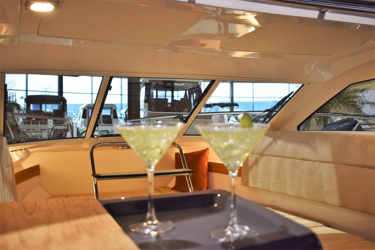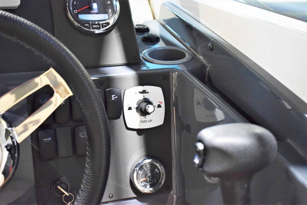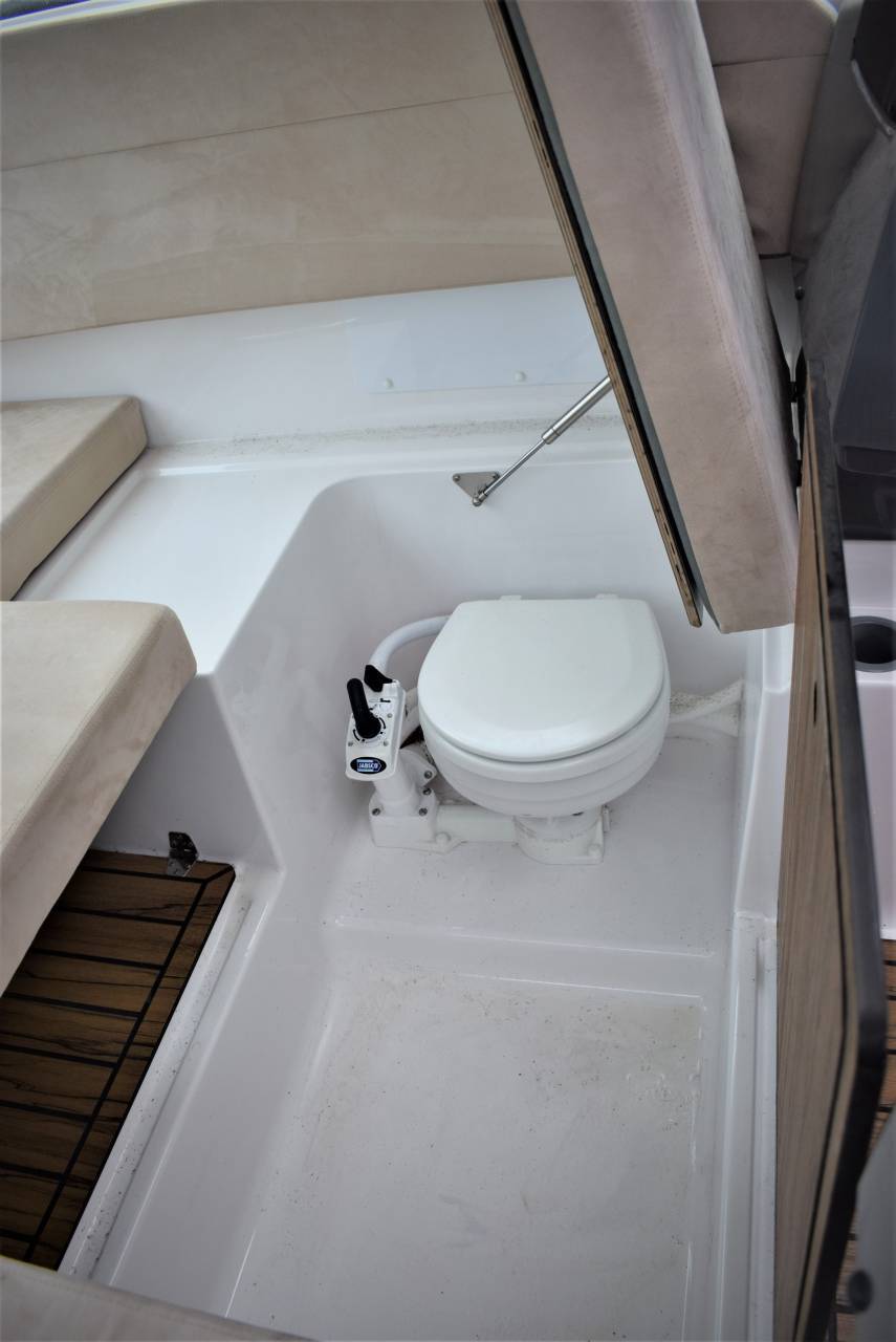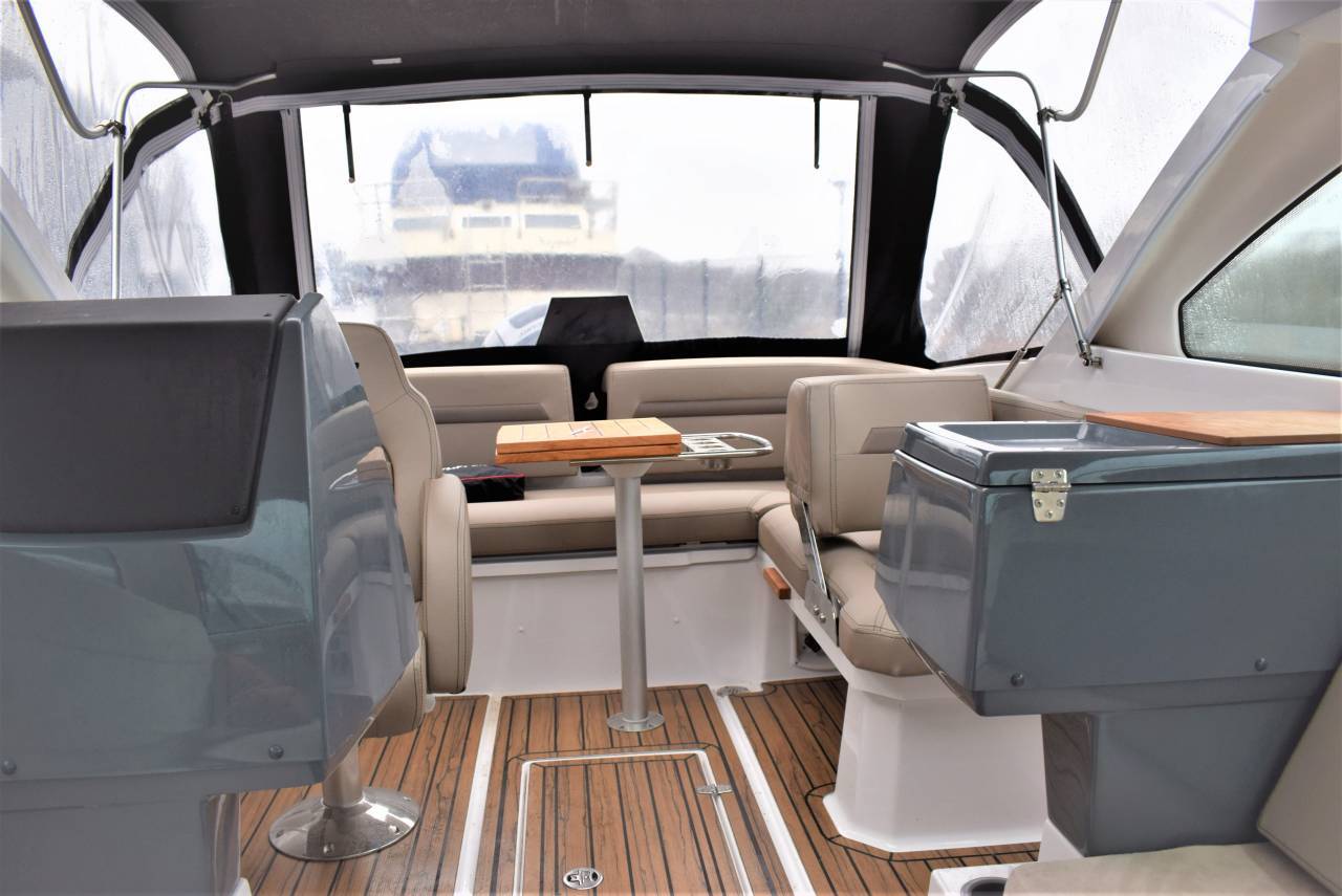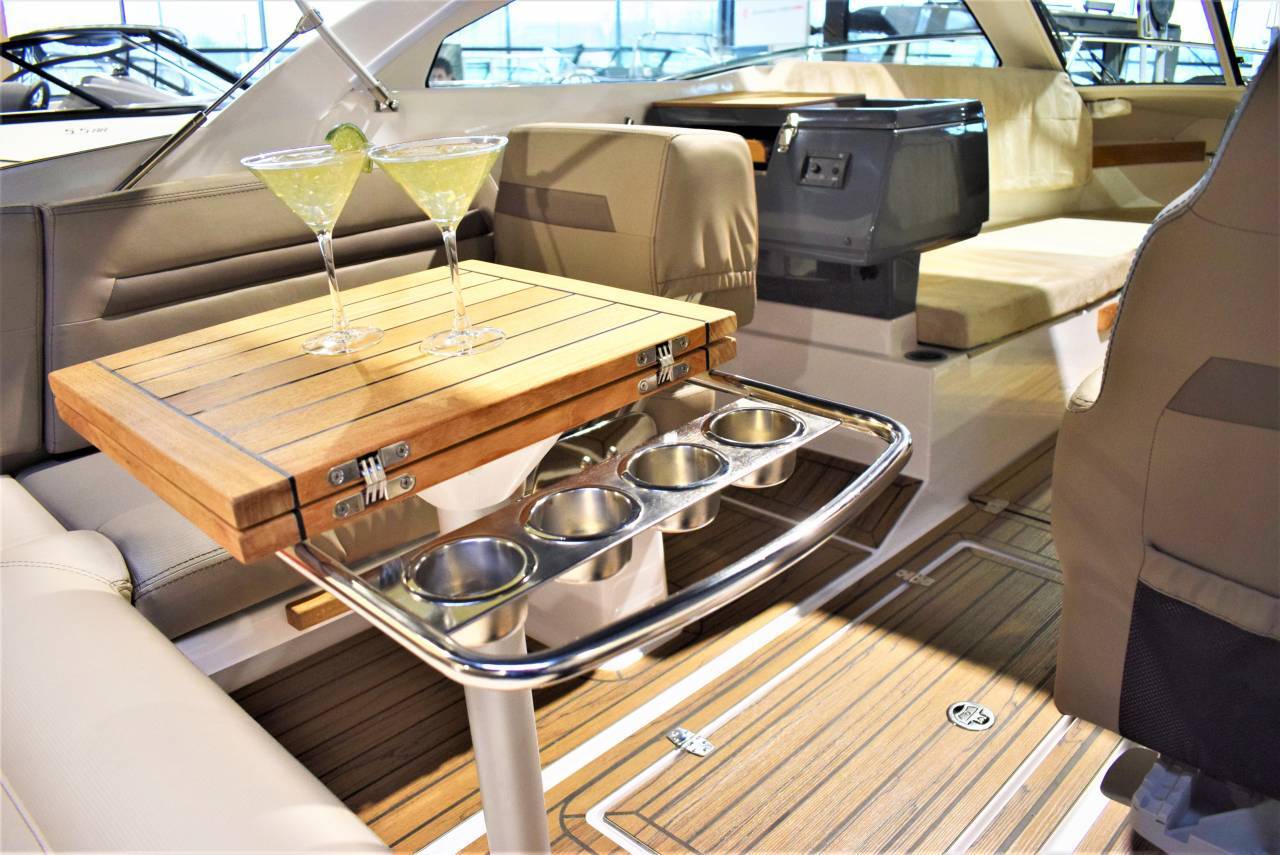Med adgang fra bådens forlængede agter badeplatforme, træder du ind igennem styrbordside til et åbent layout, hvor du bliver mødt af mere plads, end hvad man normalt kan forvente sig af en 23 fods båd, der i øvrigt bliver trykket frem i vandet, af en super sprød Yamaha F225 -V6 maskine fra 2021 med kun 60 timer på uret.