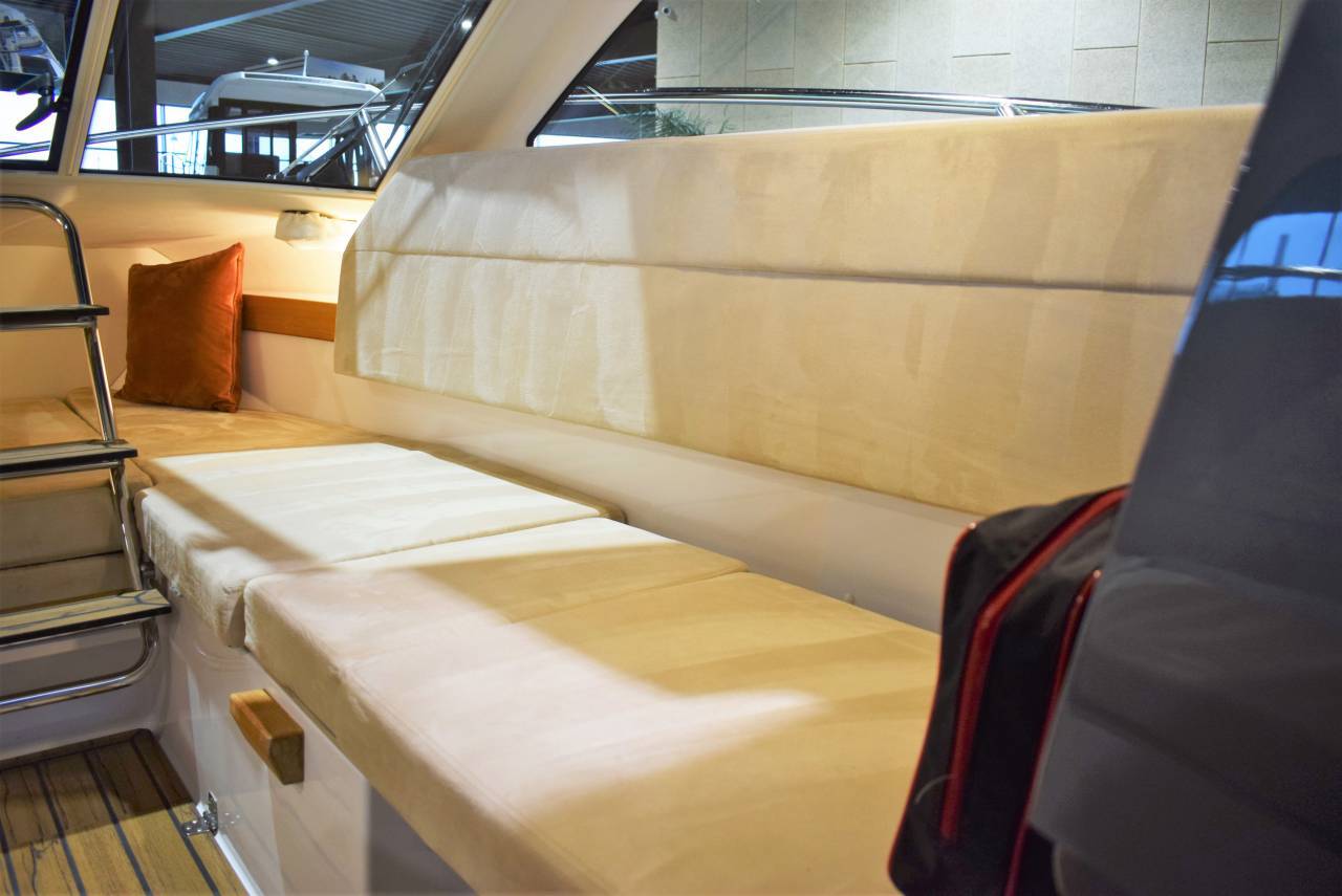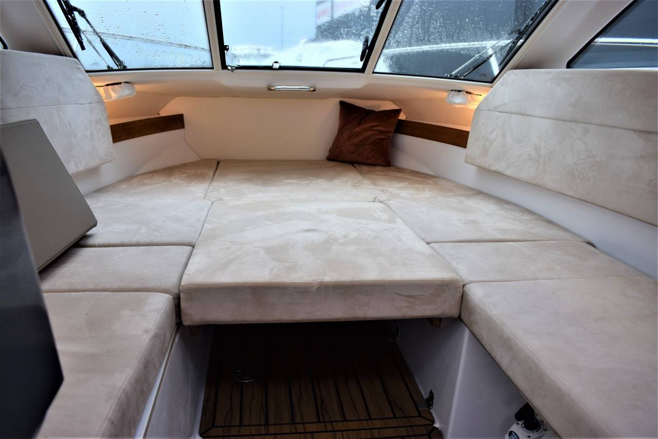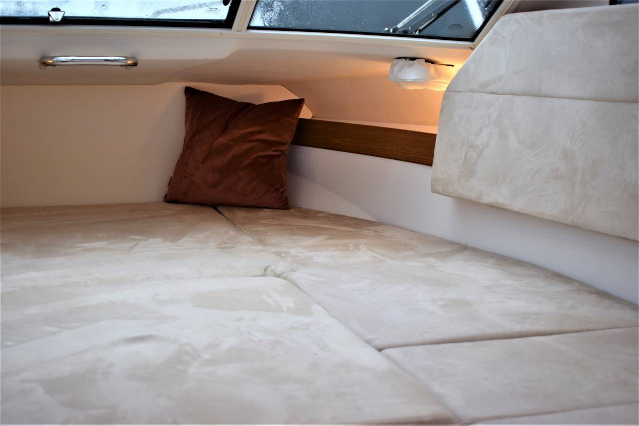 Stor L-formet sofa agten fra, der løber frem mod bagbordside, hvor et skyd-bart ryglæn definere enden af den komfortable sofa, der også kan omdannes til solseng eller sågar en ekstra mulighed for overnatning. Ryglænet er selvfølgelig tænkt til, at du kan side på første række - ved siden af kaptajnen - og se fremad, når I er på farten. Til dette område er der selvfølgelig også et lækkert høj-kvalitets klap teak bord, der kan foldes midtpå - stillet under bordpladen skjuler 4 stk kopholdere! Foran denne unikke plads finder du 700ST´s bagbord konsol, der huser et fint kogeblus og en fin lille håndvask ved siden af, med tilhørende vandhane - clever thinking! Foran konsollet kan du tage plads i et lækkert sofamiljø, i lækker beigefarvet alcantara, der pryder hele bådens forreste kahyt. Trappestigen til stævnen kan ligges ned, hvorefter den vil fungere som bundstøtte for den sidste pude, der skaber plads til 2-3 sovende i kahytten.