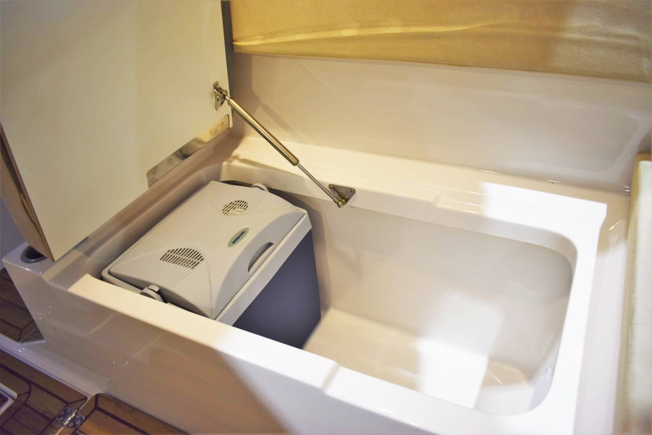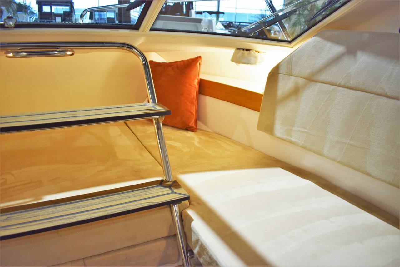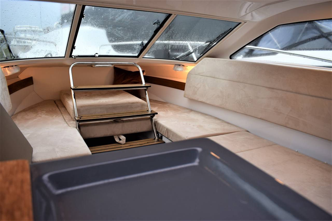 Stor L-formet sofa agten fra, der løber frem mod bagbordside, hvor et skyd-bart ryglæn definere enden af den komfortable sofa, der også kan omdannes til solseng eller sågar en ekstra mulighed for overnatning. Ryglænet er selvfølgelig tænkt til, at du kan side på første række - ved siden af kaptajnen - og se fremad, når I er på farten. Til dette område er der selvfølgelig også et lækkert høj-kvalitets klap teak bord, der kan foldes midtpå - stillet under bordpladen skjuler 4 stk kopholdere! Foran denne unikke plads finder du 700ST´s bagbord konsol, der huser et fint kogeblus og en fin lille håndvask ved siden af, med tilhørende vandhane - clever thinking! Foran konsollet kan du tage plads i et lækkert sofamiljø, i lækker beigefarvet alcantara, der pryder hele bådens forreste kahyt. Trappestigen til stævnen kan ligges ned, hvorefter den vil fungere som bundstøtte for den sidste pude, der skaber plads til 2-3 sovende i kahytten.