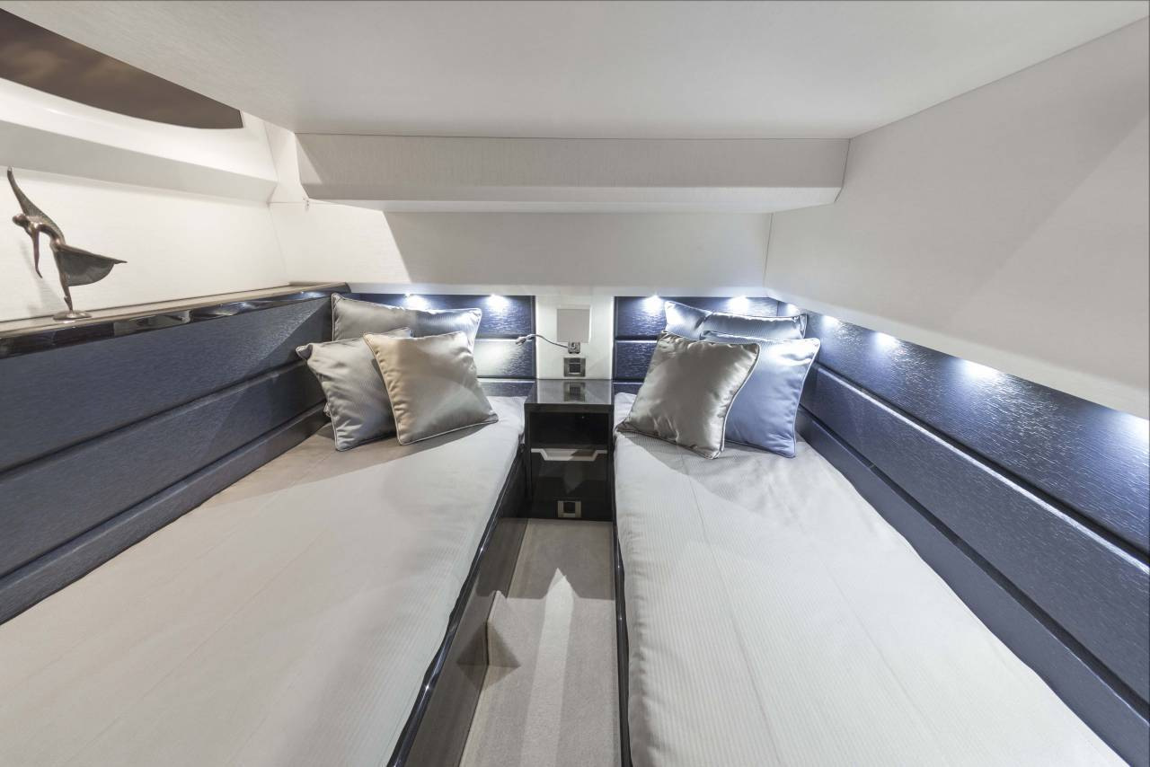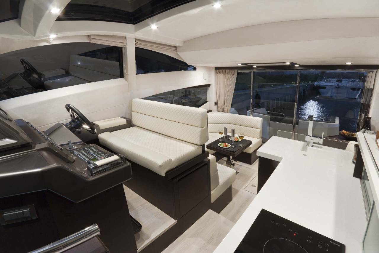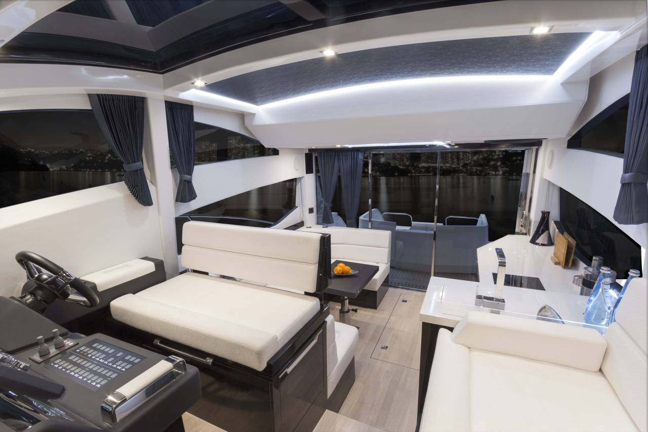 Hele herligheden skubbes frem i vandet, af de to lækre og økonomiske 300 hkVolvo Penta D4 maskiner med DPI, som fra både pilotplads i saloonen eller påflybridgen, kan dokkes vha. yachtens joystik styring. Fra Kaptajn-stolen har dualt hvad du behøver, lige fra trimtap panel, bowpropel betjening, Fusion musik betjening,til autopilot og ikke mindst bådens 12” kortplotter, der også giver dig mulighedfor at overvåge agter eller maskinrum via yachtens to kameraer, eller tjekkeandre fartøjer ud via radarsystemet der sidder under de to sortlakerede ”domes”på toppen af båden. Oppe på skydecket har du den fleste funktioner som frakaptajn stolen, blot på en lidt mindre 9” skærm.