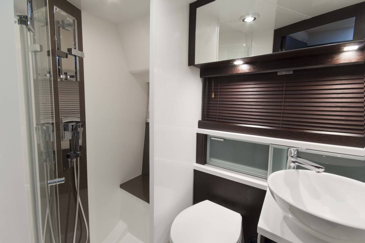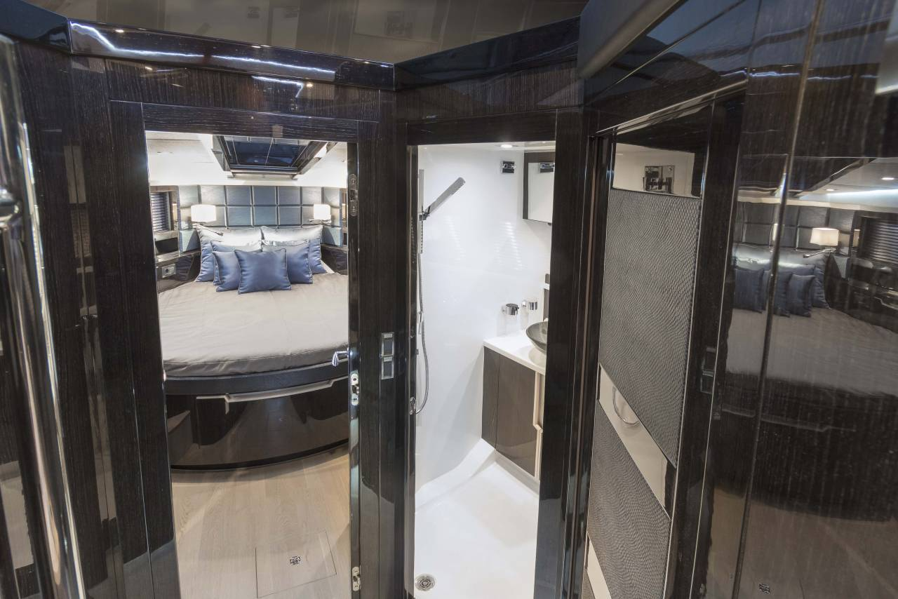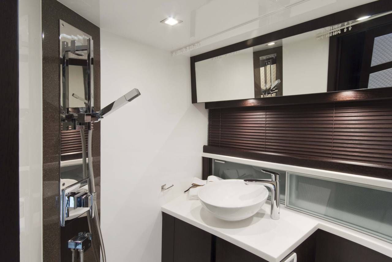Efter en lang solrig dag på vandet kan i gå nedenunder i en af yachtens 3 suite,der alle er udført i samme lækre materialer som i saloonen – alle sovepladserhar deres eget kantsyede sengetæppe med tilhørende pyntepuder farven DelhiBeaver, der er med til at definere luksusen ombord. Her finder du i øvrigt ogsåyachtens to badeværelser, der som i køkkenet er udfør i en kombination af mat lakereteg og Antarcica Corian bordplader. Hele området under dæk tilbyder høj grad afkomfort og privatliv, imens sammensætningen af materialer og den høje grad affinish, som tømrer, snedkere og syrisker har efterladt, er med til at skabe etfremragende og afslappende interiør.