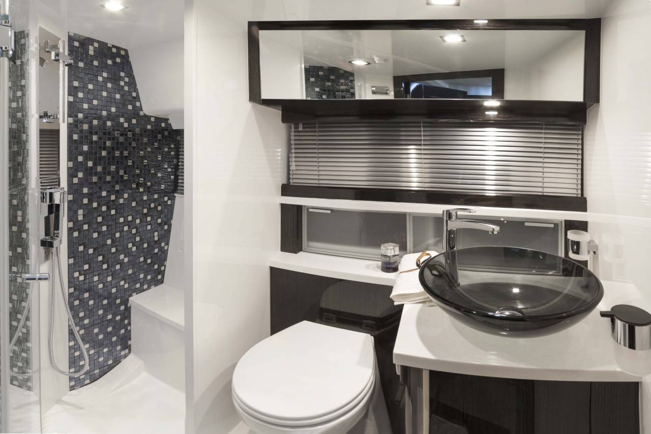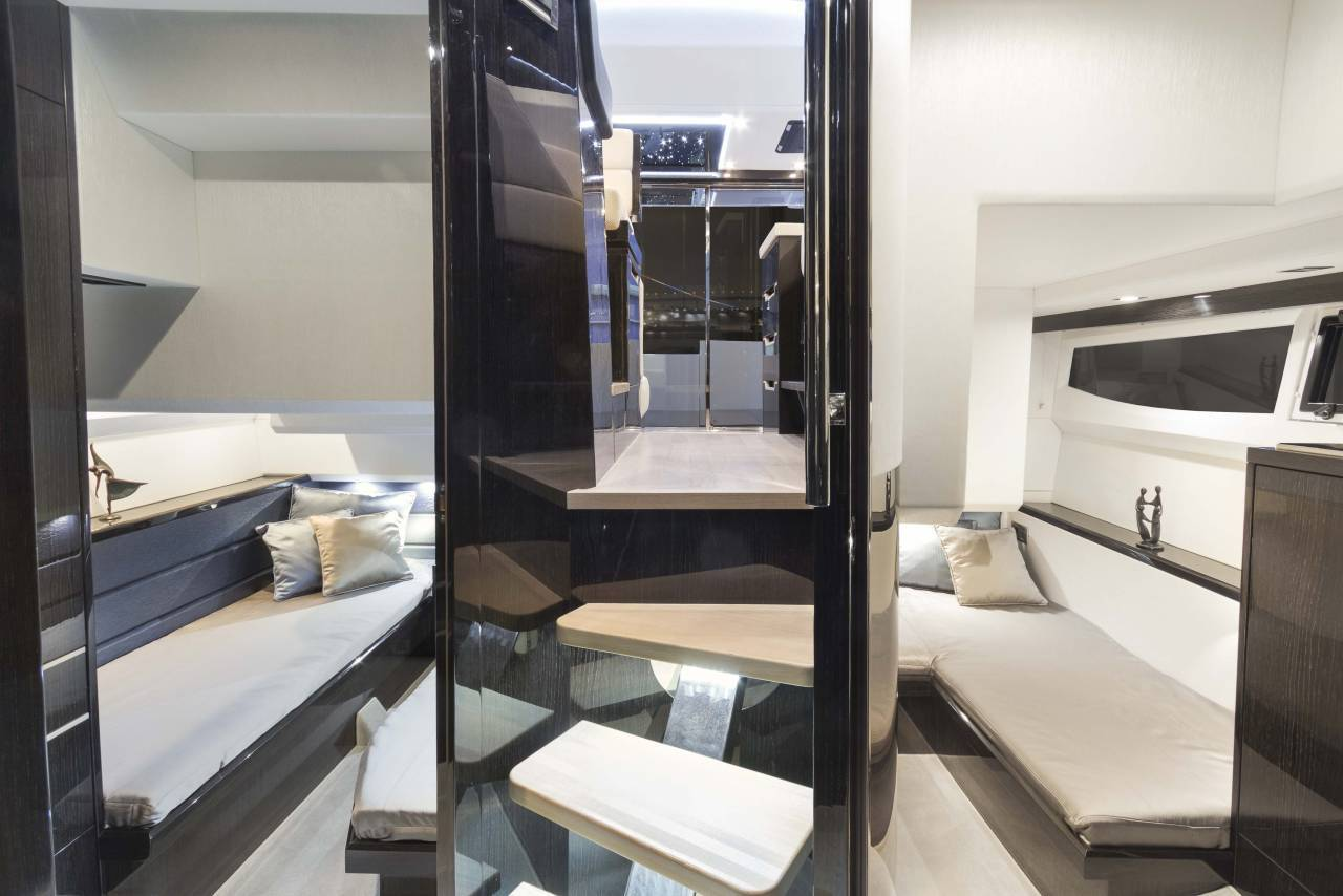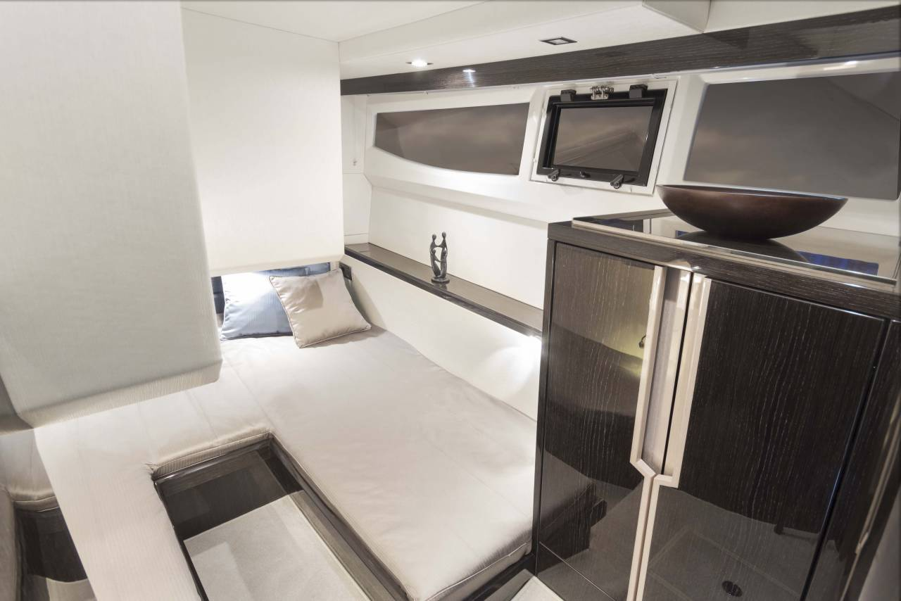 Find tre gode fremadrettede siddepladser og to gode solsenge på toppen, udenat gå på kompromis med de smukke og slanke look der kendetegner en rigtigyacht. Over kaptajn-pladsen har du mulighed at åbne op til himlen, vha. etelektrisk glasskydetag og fra agter cockpittet tillader en smart ”drop down”trappe, nem adgang til toppen, igen helt uden at gå på kompromis med pladsen i agtercockpittet.