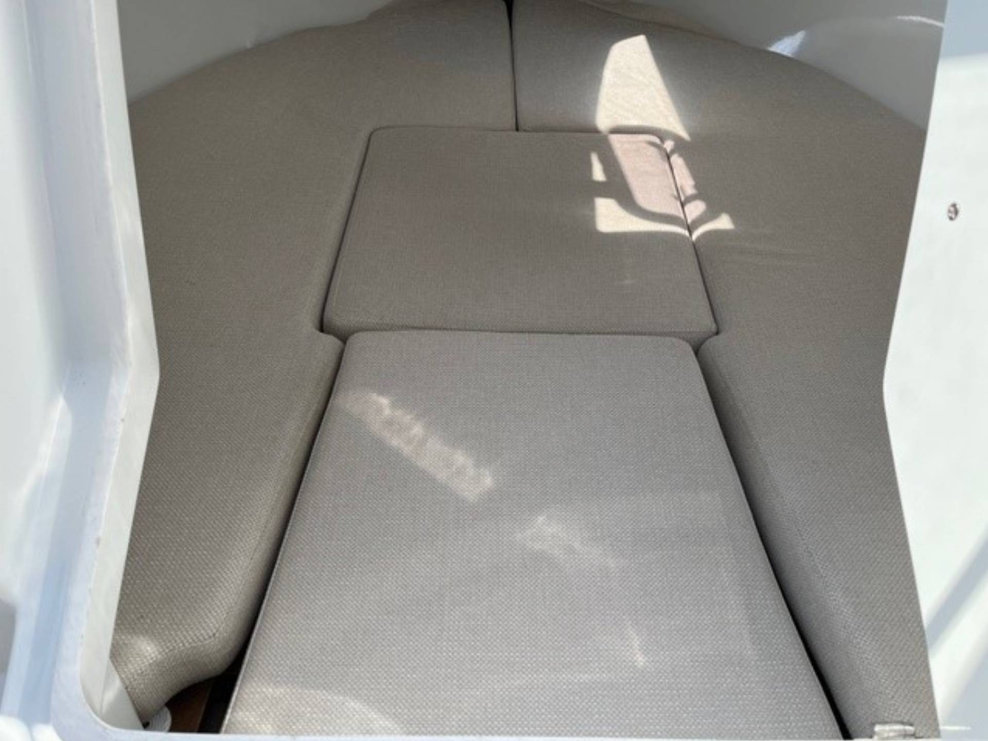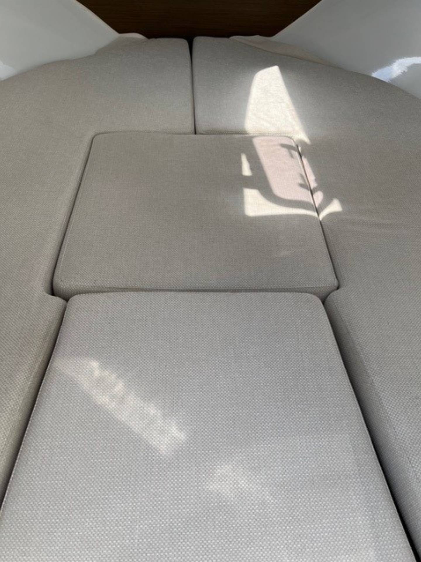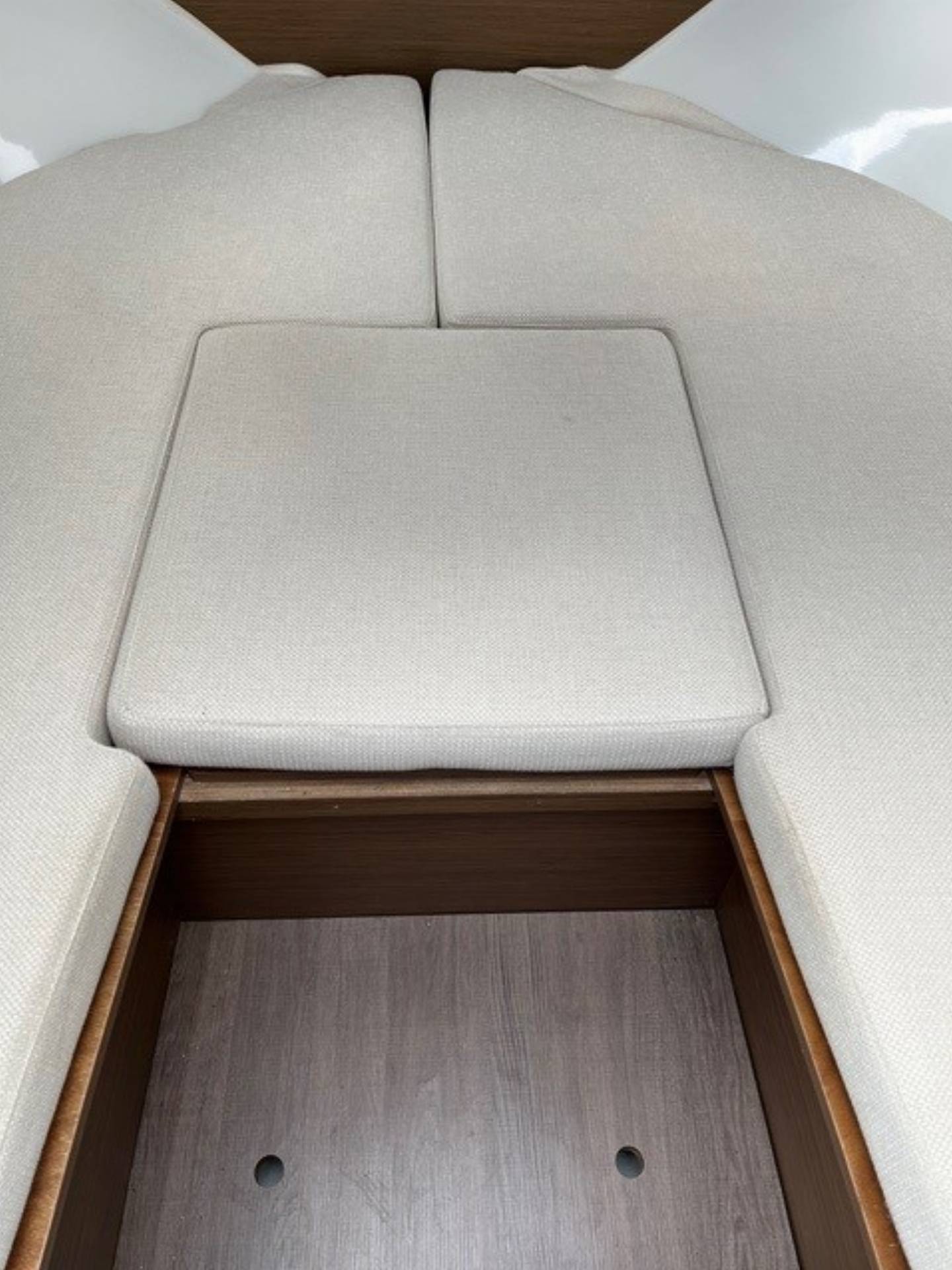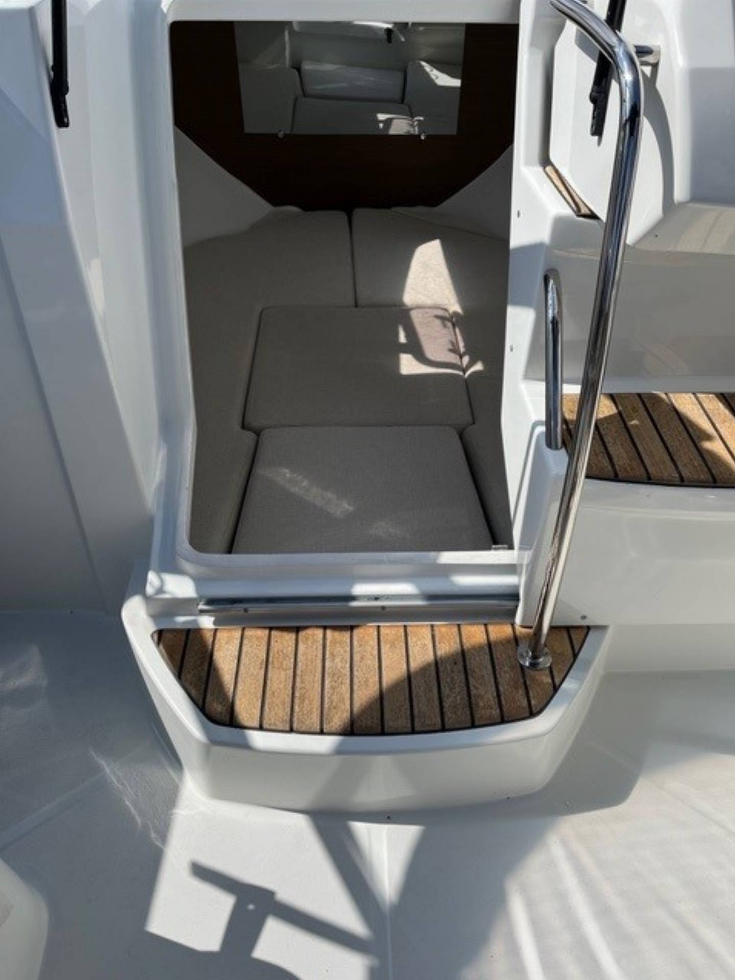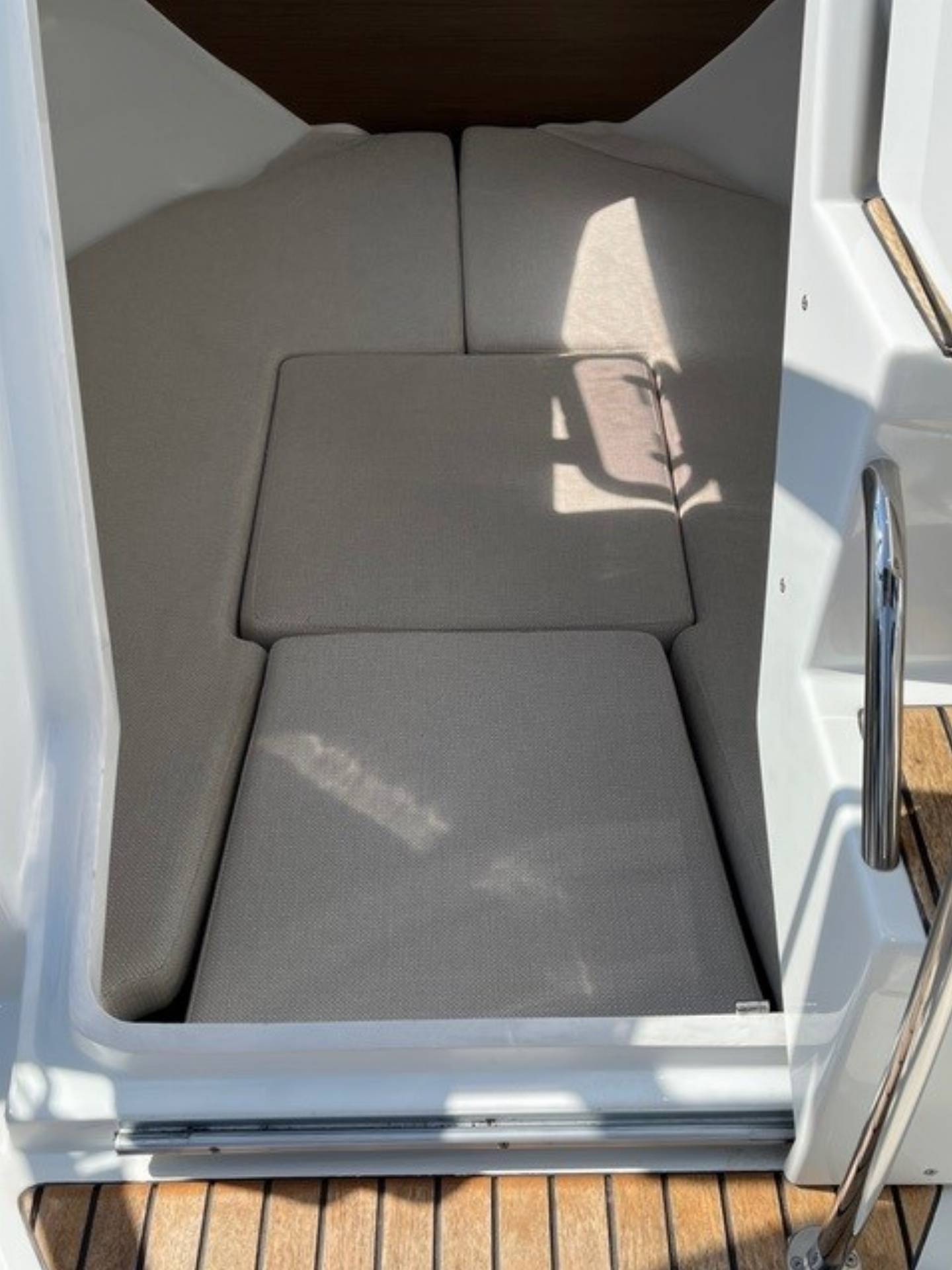 Cockpittet er indrettet med fokus på komfort og funktionalitet. Her finder du en komplet hyndepakke og en integreret solseng, der skaber et afslappet loungemiljø om bord. De udvidede badeplatforme i hver side gør det nemt at komme i vandet og giver ekstra plads til ophold agter – begge platforme er belagt med teak, hvilket fuldender det eksklusive udtryk og føles behageligt under fødderne.