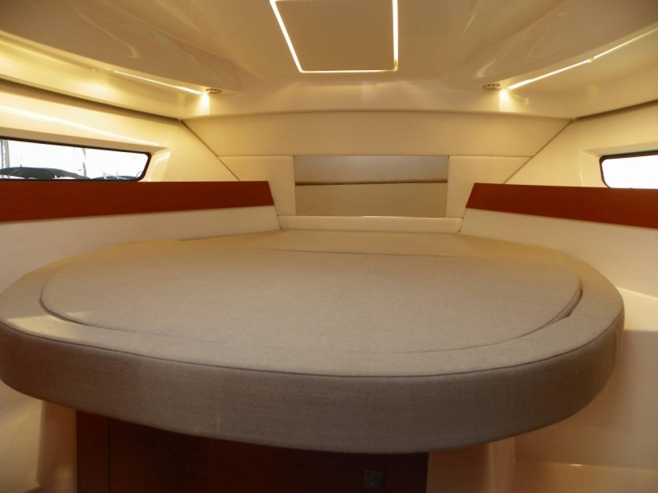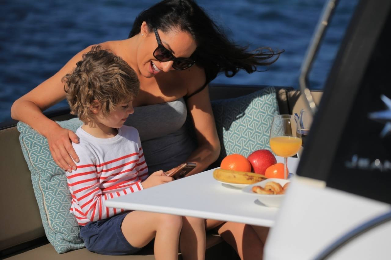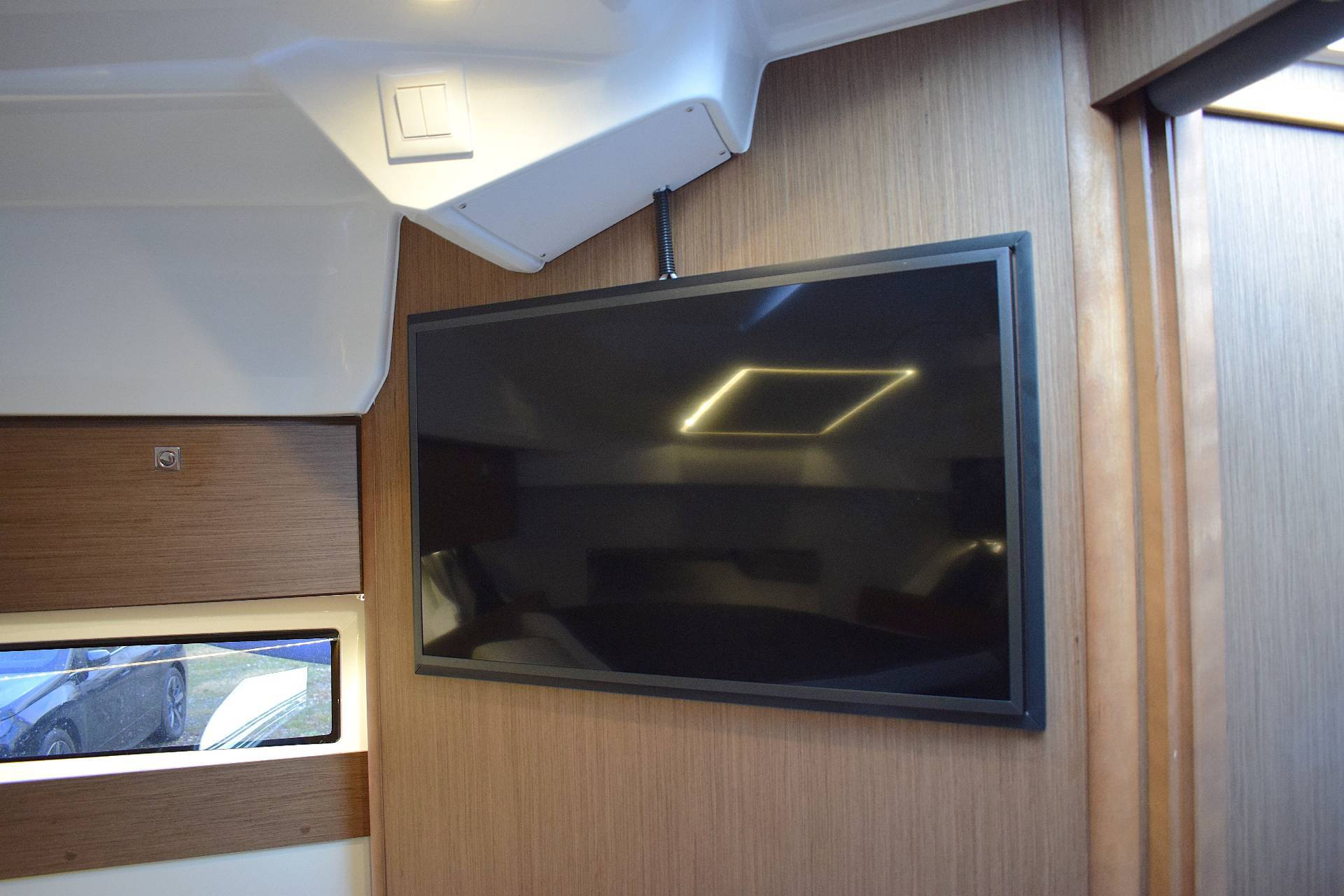 Fra det øjeblik du træder ombord, mærker du kombinationen af moderne design og gennemtænkt funktionalitet. Det store cockpit kan på få sekunder omdannes til en hyggelig lounge, og med cockpit-teltet bliver sæsonen markant længere. Indenfor fortsætter oplevelsen med et lyst og indbydende salonmiljø, hvor du helt naturligt føler dig hjemme, uanset om formålet er weekendture, ferie eller blot en eftermiddag på vandet. Det store 32” fladskærms-tv med Chromecast i mastercabin og integreret visning i Garmin-plotteren gør den indvendige komfort ekstraordinær, og bådens Wi-Fi skaber frihed til både arbejde og underholdning undervejs.