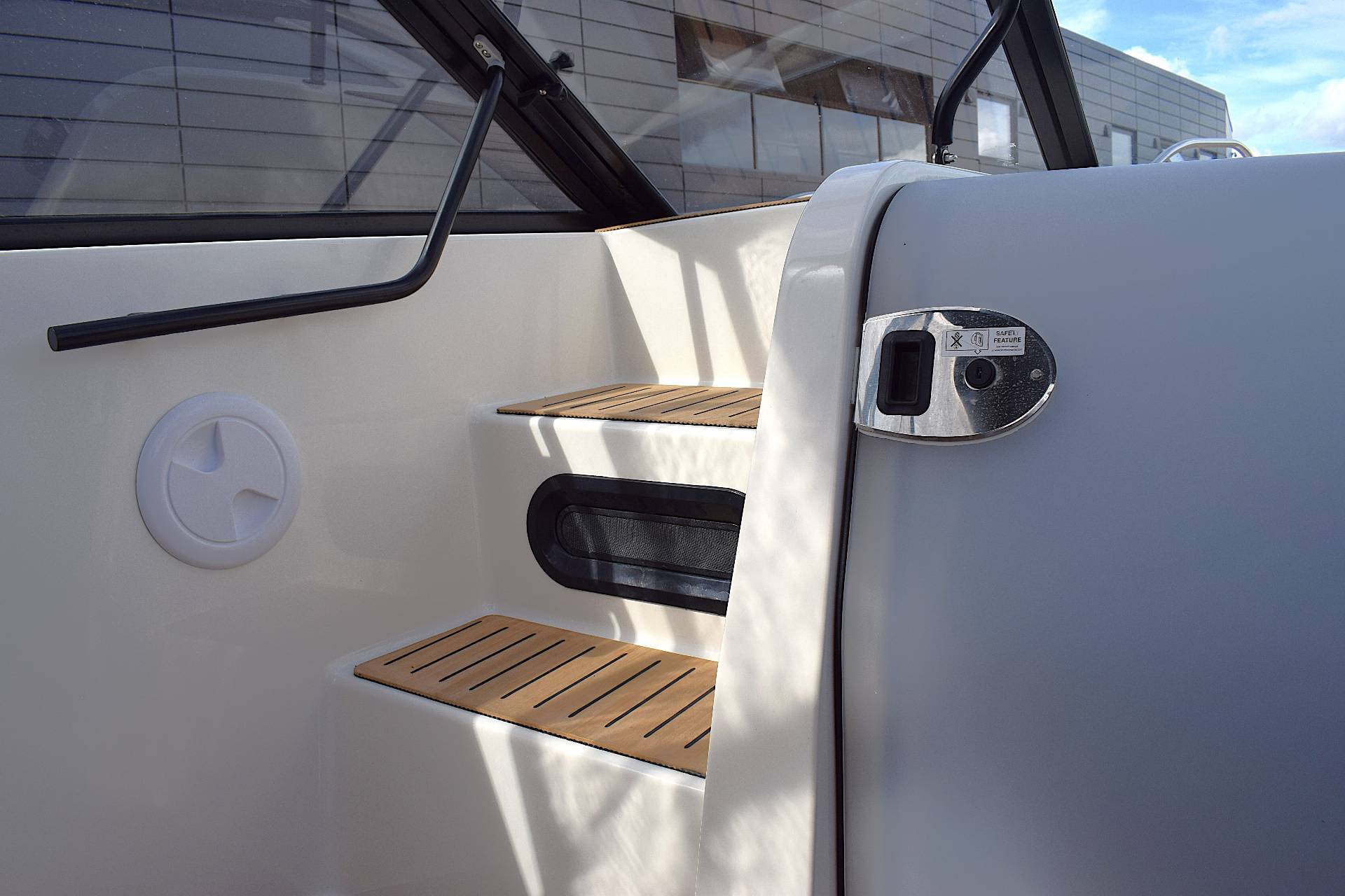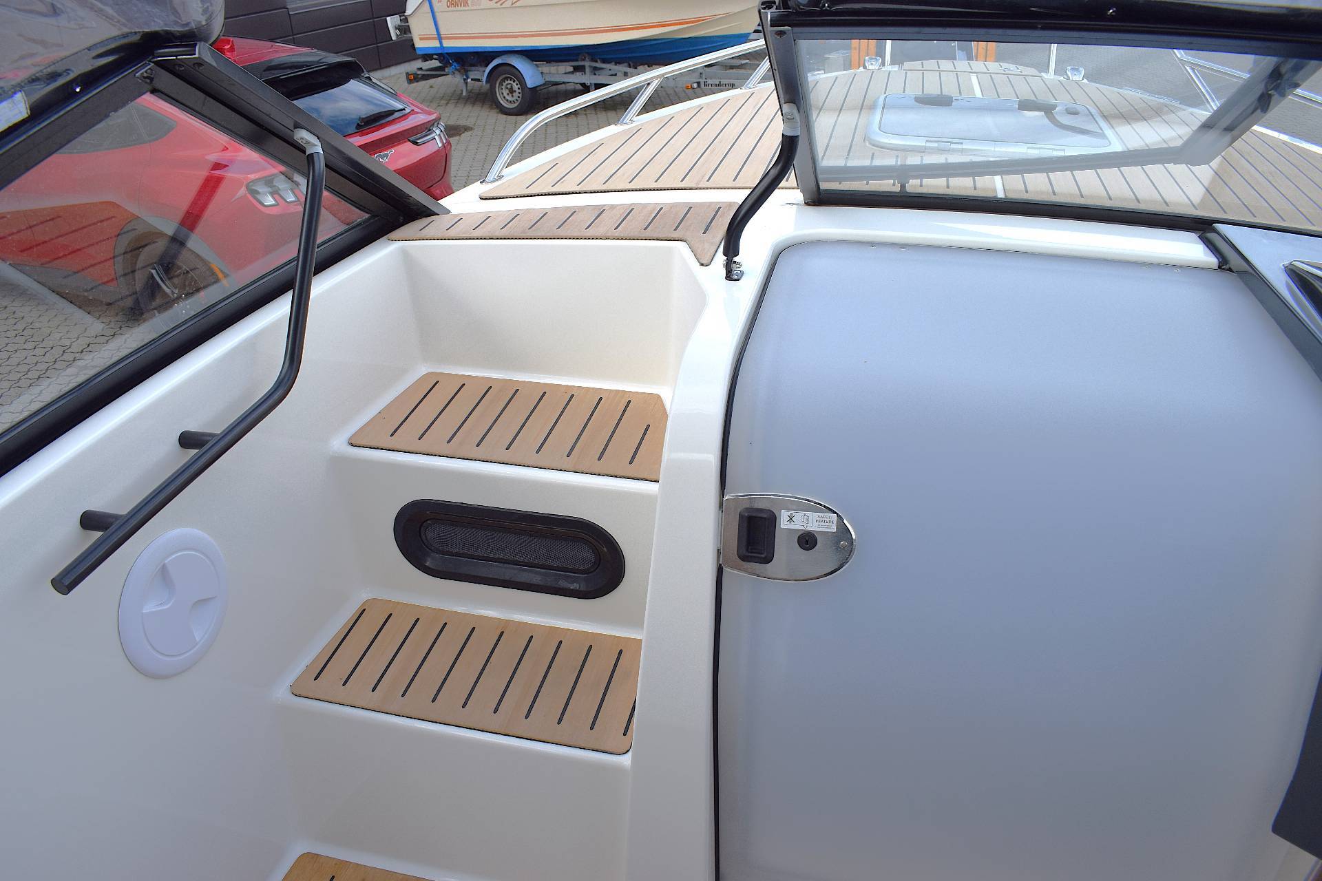 Denne cruiser forener komfort, stil og funktionalitet i en kompakt og letsejlet pakke, perfekt til både nybegyndere og erfarne sejlere. Med kunstteakdørk over hele båden får du ikke blot et elegant udtryk, men også et skridsikkert og vedligeholdelsesvenligt dæk. Camperkalechen giver dig mulighed for at forlænge sæsonen og skabe læ for både sol og regn, mens den rummelige kahyt med sovesengspakke og luge tilbyder overnatningsmuligheder og opbevaringsplads i særklasse.