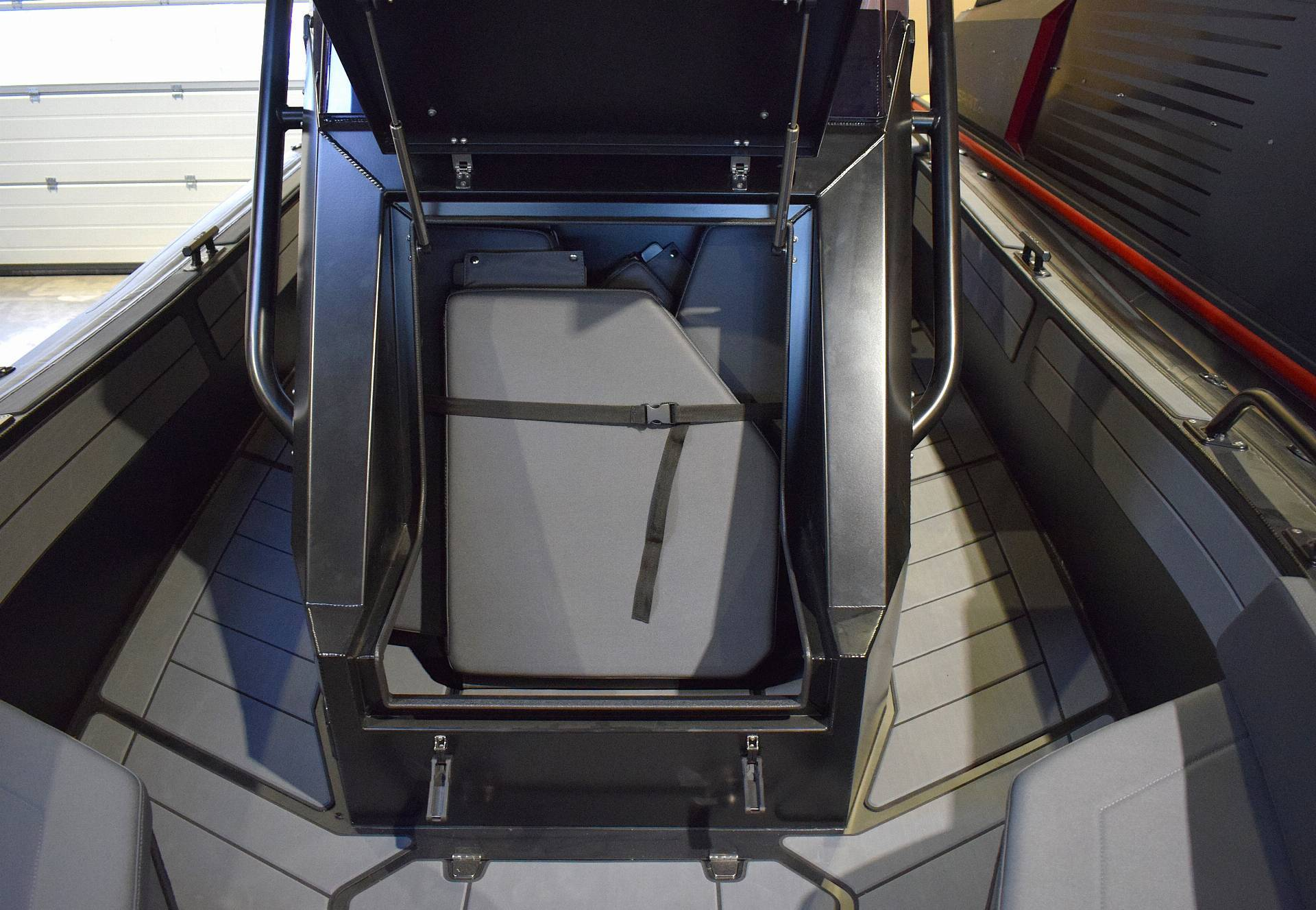 Hele båden er selvfølgelig pulverlakeret i Aqua Spirits velkendte mat mørkegrå farve - skal båden bruges i forsvaret eller i anden beredskab, kan den leveres i andre farver som du eller I bestemmer.