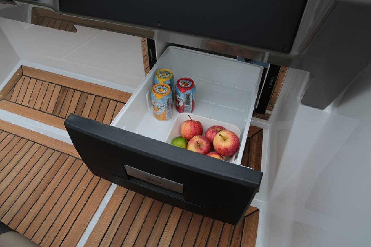 Desuden får du praktiske funktioner som faste indenbords fenderholdere, LED docking lights, højt søgelænder og gribelister én mas.