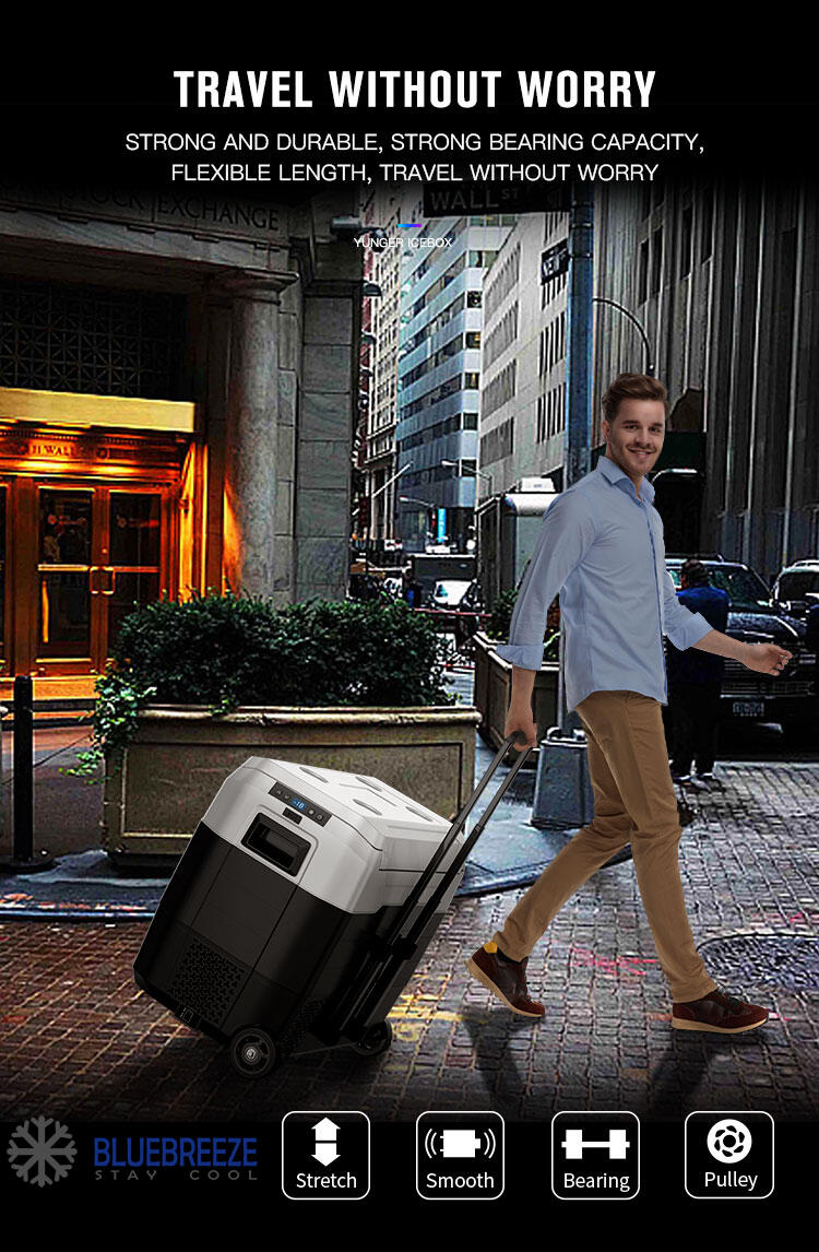 BlueBreeze ALG 50, Super Cooler, en stor elektrisk køleboks på hjul med elektrisk kompressor. Modellen passer fint til en større familie og mindre selskab. Køle-effekten er optimal og strømforbruget meget lavt. Modellen har også en indbygget "Battery protect" som automatisk beskytter dit bilbatteri og slukker kompressoren, hvis stømniveauet begynder at blive lavt eller. Du kan også vælge at anvende køleboksen med almindelig stikkontakt. Dette er en el kølebox som i den grad er transportabel, med indbygget hjul og håndtag er det nemt at transportere mad og drikke.